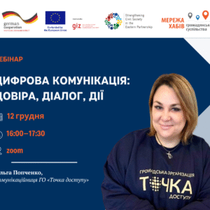 Розвивайся з нами, щоб впливати на суспільні зміни!Анонси 23 Гру 25 Онлайн-тренінг «Участь без бар’єрів: як зробити громадську участь інклюзивною та доступною для всіх» 18 Гру 25 Онлайн-тренінг «Правові інструменти залучення громадян до вироблення управлінських рішень на рівні громад» 16 Гру 25 Логіка донорів: як ОМС і громадськості залучати підтримку 12 Гру 25 Вебінар «Цифрова комунікація: довіра, діалог, дії» Останні новиниПартнерство з донором: як бути зрозумілими та переконливимиЯк думають донори, чому одні грантові заявки виграють, а інші – ні, і як будувати…Штучний інтелект і громади: як зробити складне простішимШтучний інтелект – це не про заміну людей. Це про те, щоб люди робили, що…Продовжено тендер на відбір постачальника брендованої та поліграфічної продукціїТЕХНІЧНЕ ЗАВДАННЯ НА ВІДБІР ПОСТАЧАЛЬНИКА БРЕНДОВАНОЇ ТА ПОЛІГРАФІЧНОЇ ПРОДУКЦІЇ Громадська спілка «Мережа хабів громадянського суспільства…Запрошуємо на вебінар «Цифрова комунікація: довіра, діалог, дії»«Мережа хабів громадянського суспільства України» запрошує на вебінар, який допоможе громадським організаціям говорити так, щоб…Наша географія Члени Мережі ГО Центр «Жіночі перспективи» Громадська організація «Агентство економічного розвитку» Громадська організація «Джерело надії України» Громадська організація «Інститут аналітики та адвокації» Громадська організація «Подільська правова ліга» Громадська організація «Неурядова організація «Сучасний Формат» Громадська організація «Волинський Інститут Права» Громадська організація «Центр підтримки громадських і культурних ініціатив «Тамариск» Громадська організація «МАРТ» Благодійна організація «Фонд громади міста Херсон «Захист» Рівненська обласна громадська організація «Комітет виборців України» Благодійна організація «Благодійний фонд «Центр громадських ініціатив» Громадська організація «Точка доступу» Громадська організація «Територія успіху» ГО «Громадський холдинг «ГРУПА ВПЛИВУ» Мережа хабів об'єднує організації громадянського суспільства з різних куточків України
