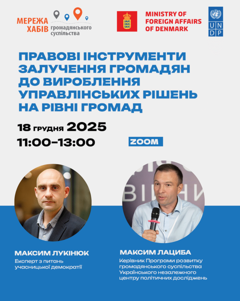Захід відбувається в межах Проєкту «Громадська участь та міжсекторальне партнерство в громадах України», який реалізує ГС «Мережа хабів громадянського суспільства України» за підтримки ПРООН в Україні та фінансування уряду Данії.