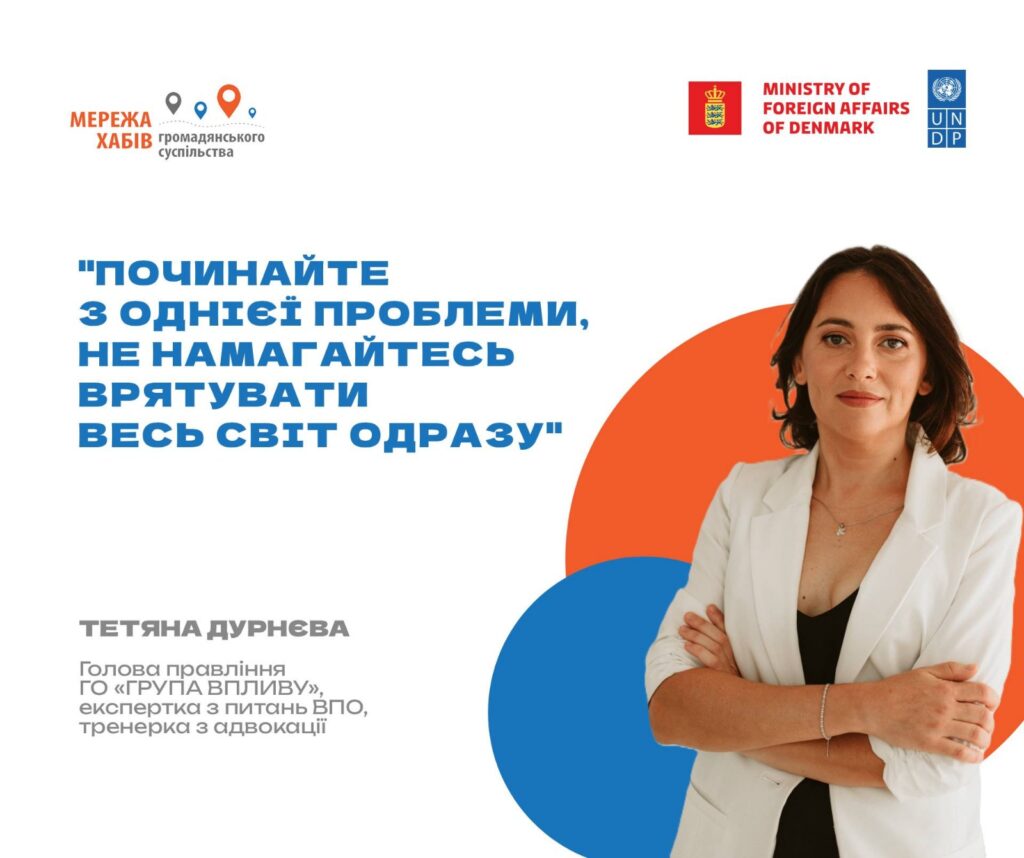 Саме так 20 років тому в Донецьку стартувала перша адвокаційна кампанія Тетяни Дурнєвої – нині голови правління ГО «Громадський холдинг «ГРУПА ВПЛИВУ», експертки з питань ВПО та тренерки з адвокації. Тоді в районі, де мешкала активістка, не було безпечного пішохідного переходу. А згодом з’явилися масштабні кампанії, коаліції, зміни в законодавстві й тисячі людей, які повірили: вплив можливий.